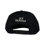 水ナスに滴る水滴をイメージしたグラフィックの上にMHロゴが刺繍されています。
