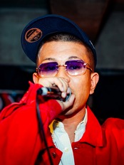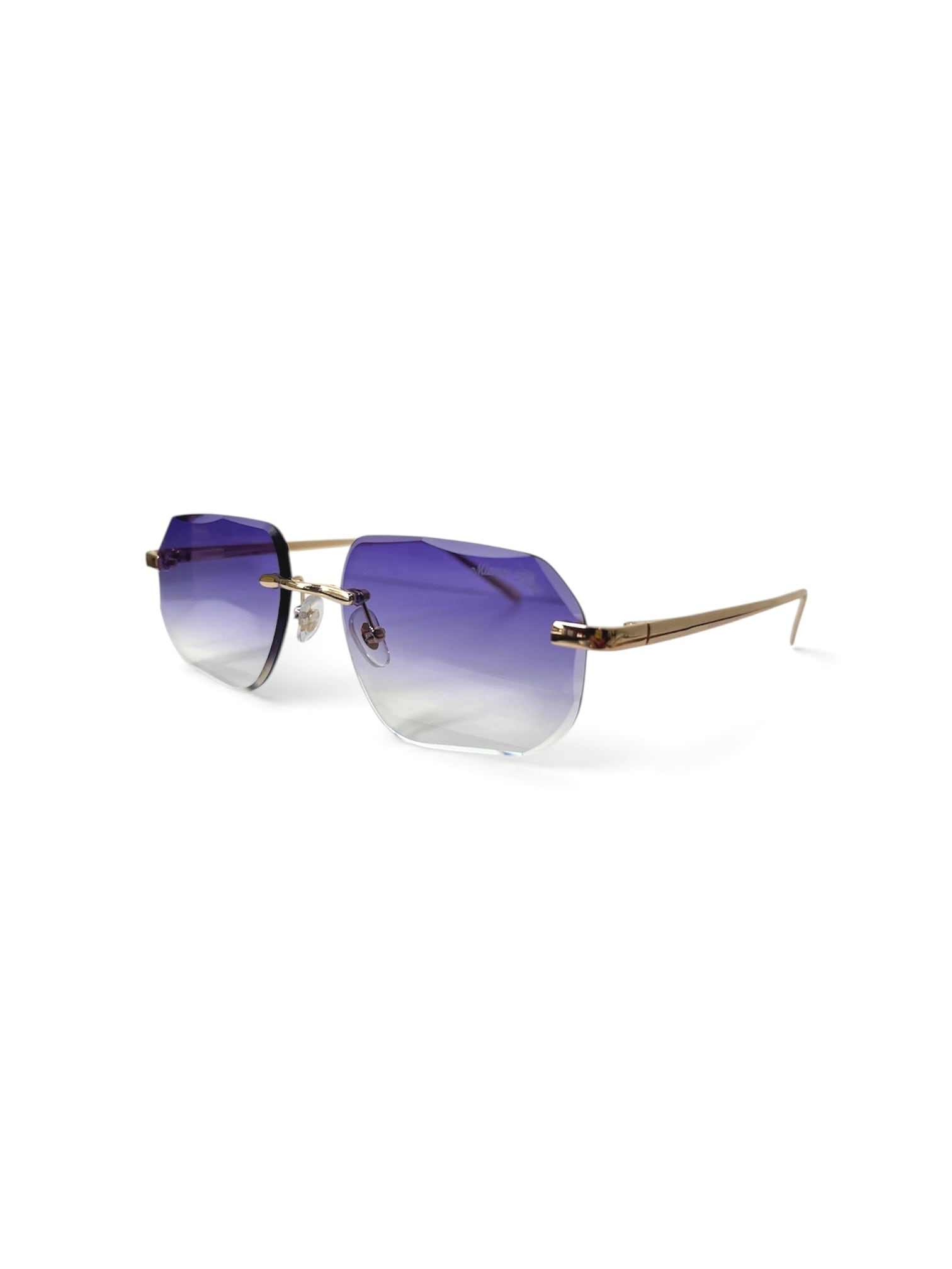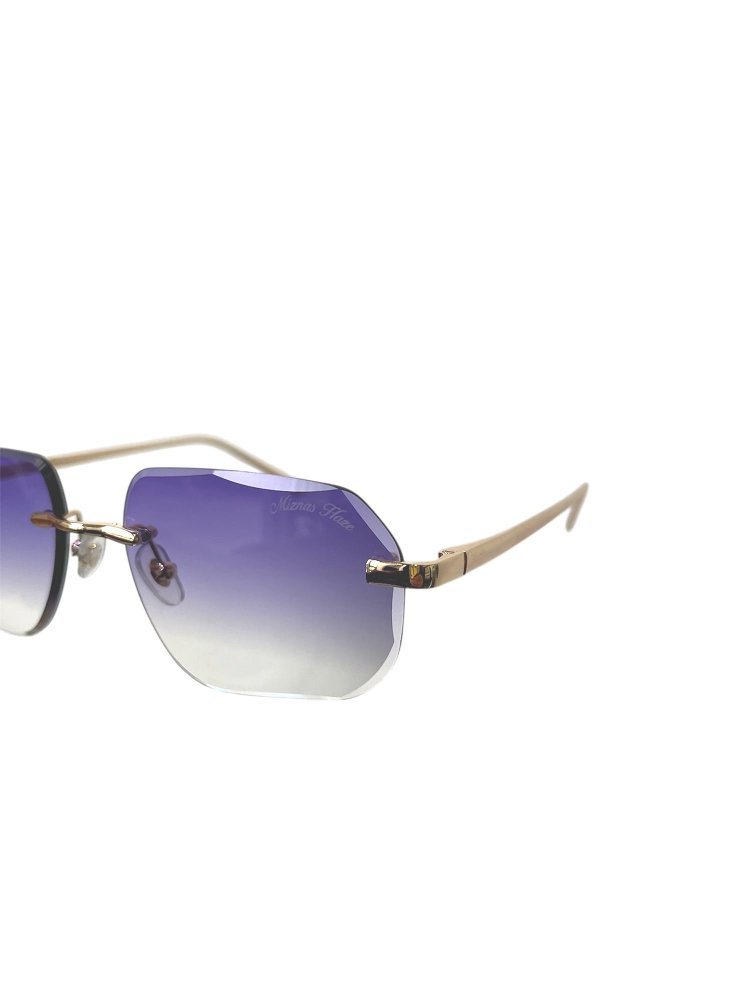 ゴールドトーンのフレーム、パープルからクリアへと自然に変化するグラデーションレンズにMIZNAS HAZEの刻印が施されています。