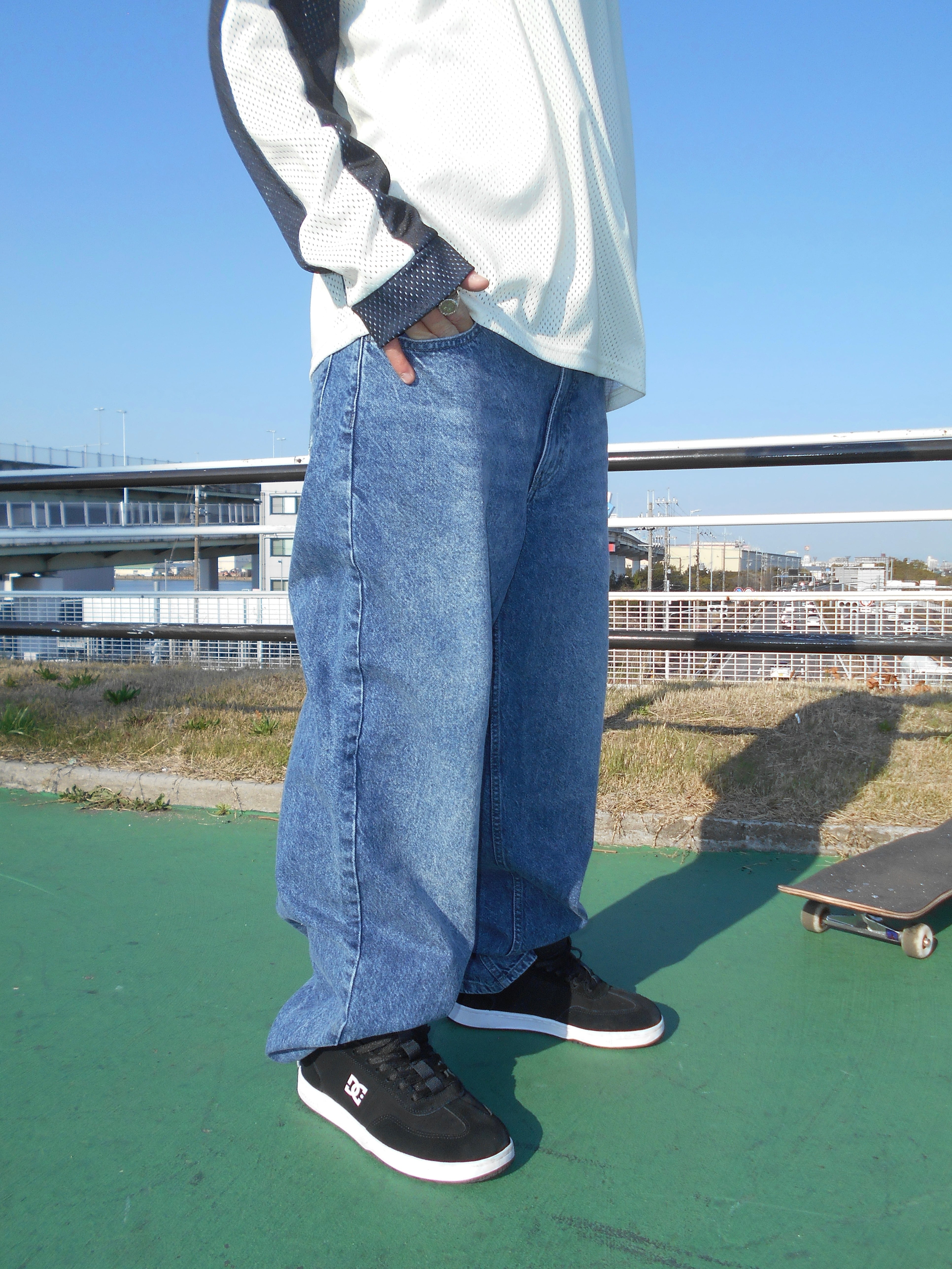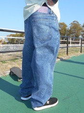 ワイドシルエットで、裾にかけて軽くテーパード。太さはありつつ、すっきりまとまります。